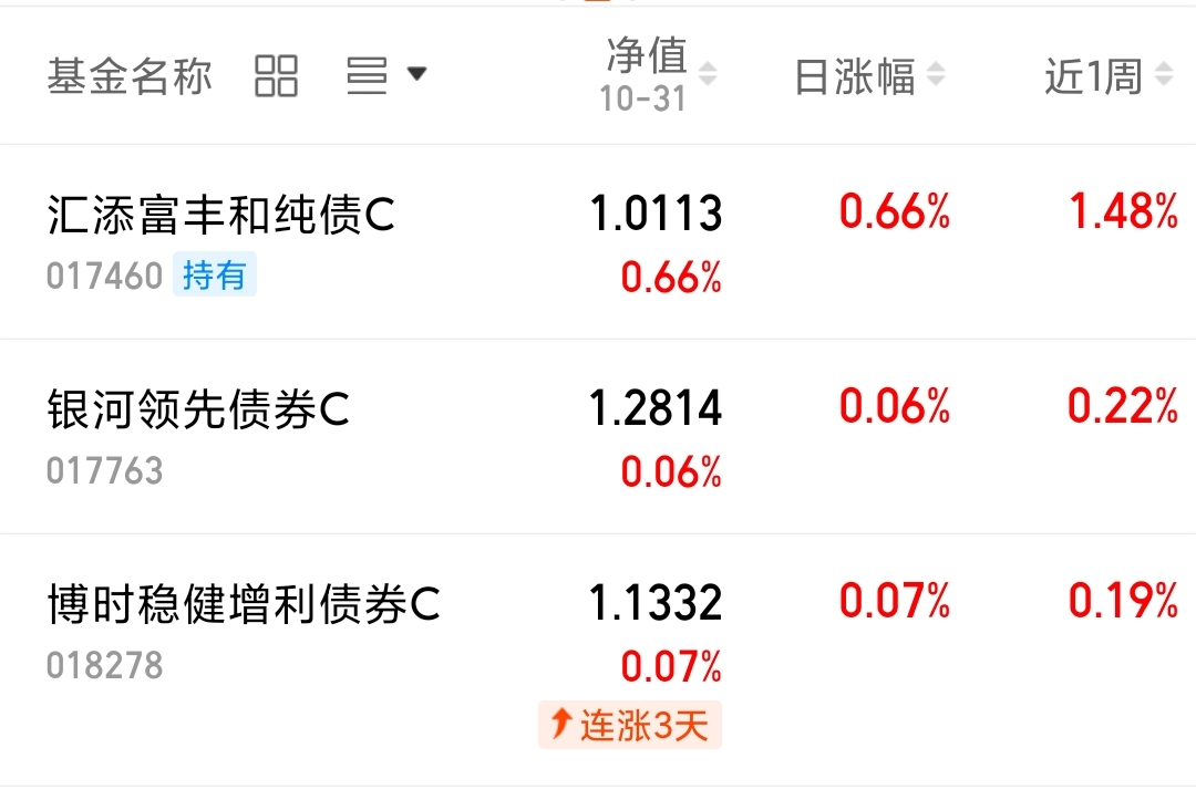 看最近债市晴天还是蛮不错的呀,我感觉稳健配置的话现在性价比蛮高的,也不用怎么操心。我看$汇添富丰和纯债C(OTCFUND|017460)$今天收涨66个蛋,这里是30年超长债波段利器,久期恒定适合波段,准备定投咯~