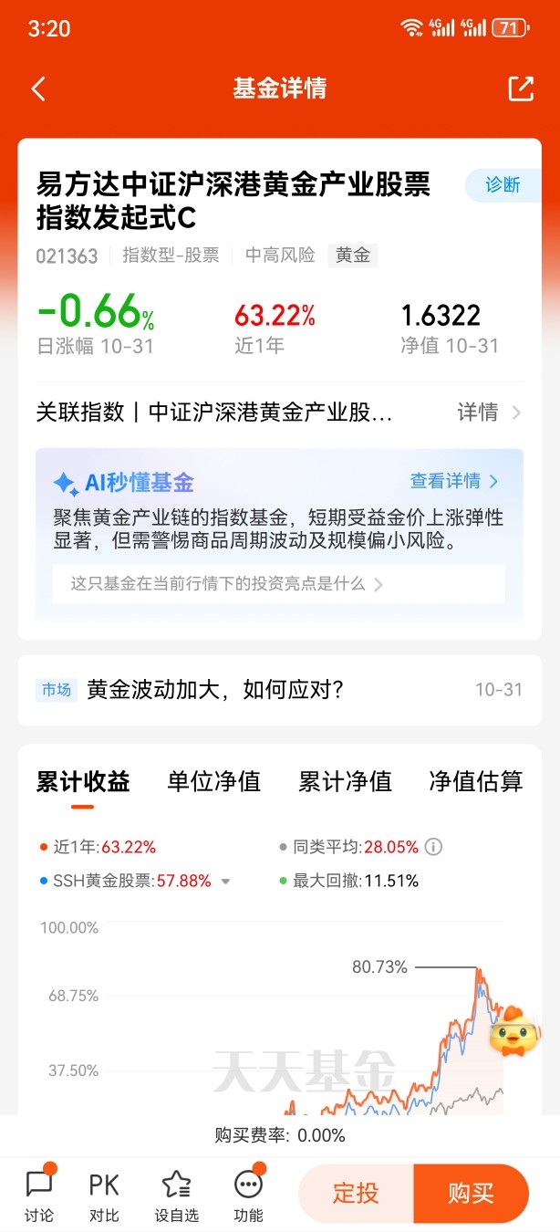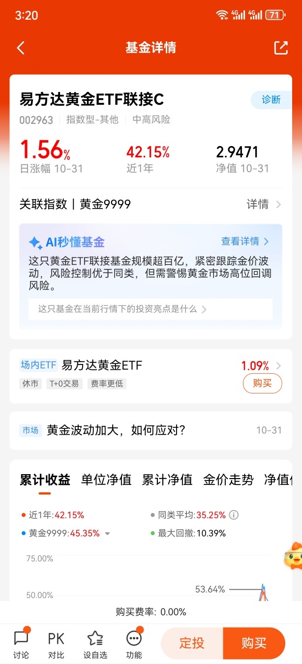 易方达黄金ETF联接C的产品特性恰好适配波动市需求。作为跟踪黄金ETF的场外基金,其风险收益特征与国内黄金现货品种高度一致,能精准反映金价变化,且无需担心实物存储问题。更重要的是,其费率设计对中小投资者友好,短期持有成本可控,契合波动市中灵活调整的需求。