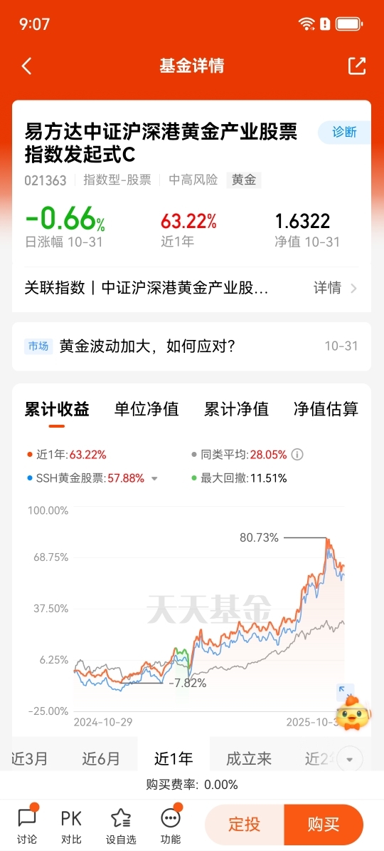 说到投资工具,易方达黄金ETF联接C简直是"黄金界拼多多":白菜价:管理费0.15%+托管费0.05%,比楼下奶茶店还便宜。闪电发货:T+1到账,比外卖小哥还准时。透明厨房:91%仓位直投黄金ETF,持仓比渣男的聊天记录还干净。最绝的是C类份额,持有30天就免赎回费。相当于买菜大妈都嫌手续费贵,但这里手续费低到可以忽略——适合我们这种"三天打鱼两天晒网"的佛系投资者。终极奥义:设置止损线,跌破就跑别逞强。