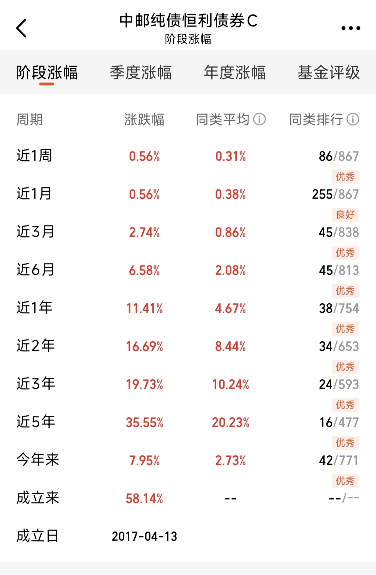 未来都是比较看好这个混债$中邮纯债恒利债券C$,上周整体表现可以,收货了56个蛋