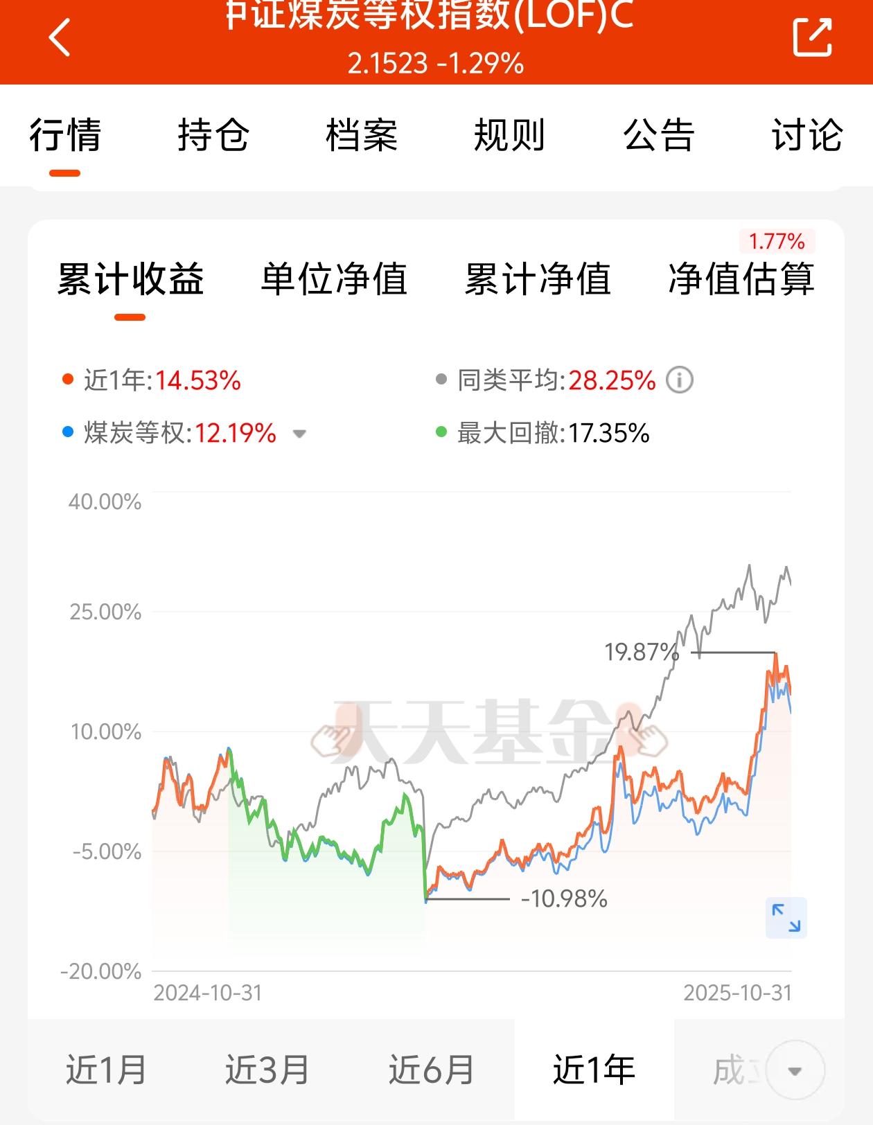 最近市场调整,板块行情切换快,追高容易被套,而且高位的科技股开始向低位板块切换。$招商中证煤炭等权指数(LOF)C$ 最近低位的煤炭板块迎来了春天,开始步步攀升,今天涨幅估值1.77%,逆势大涨,表现非常不错,近一年涨幅14.53%,年化率也不错哦。冬天临近,北方天气寒冷,对煤炭需求激增,流星相信,煤炭会走一波像样的行情!