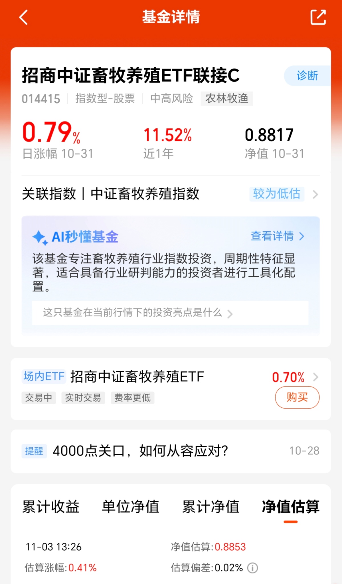当前市场行情分歧较大,从盘面来看,前期热门赛道回调较多,所以我选择换个方向布局,而近期生猪产业释放“积极信号”,引导生猪产业,往提质稳价方向发展,并且在供需关系驱动下,畜牧养殖板块呈现出明显的上升周期,其中$招商中证畜牧养殖ETF联接C(OTCFUND|014415)$持仓精准跟踪养殖业,目前实时估值稳定上涨,我也准备定投起来了!
