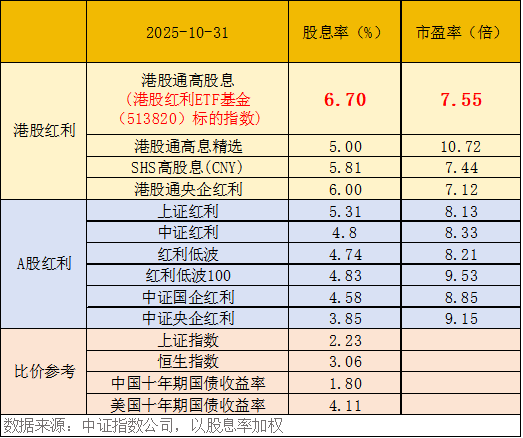 数据显示,中证港股通高股息投资指数股息率达6.7%,远超A股、港股主流红利指数,最新估值(市盈率)仅为7.55倍,具备一定估值性价比!