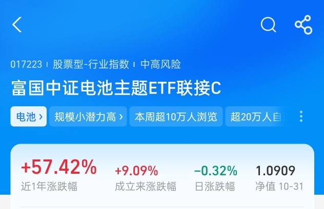今天布局了$富国中证电池主题ETF联接C$ 它的表现较为稳健。近1年收益率达57.42%,业绩挺不错的,持仓紧密跟踪CS电池指数,覆盖动力电池、储能电池等高成长赛道,受益于新能源产业政策与技术突破。其重仓股涉及固态电池产业链,有技术突破的催化潜力。同时存在估值回归空间,长期发展值得关注。今天也是布局上车了,期待它后面的表现。