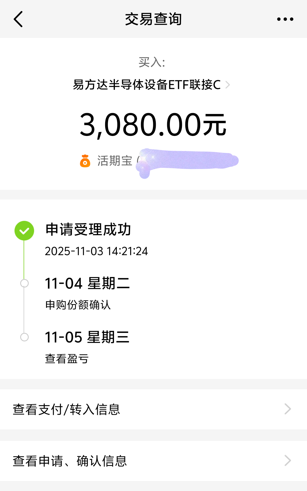 大盘今天整体跌了不少,大科技板块回调,半导体设备今天也调整了,半导体设备是芯片产业的基石,国产化需求极为迫切。在外围制约背景下,本土产线自主可控成为刚性需求,推动设备环节迎来黄金发展期。长期看好半导体设备版科技,今天加仓易方达半导体设备C3000元!