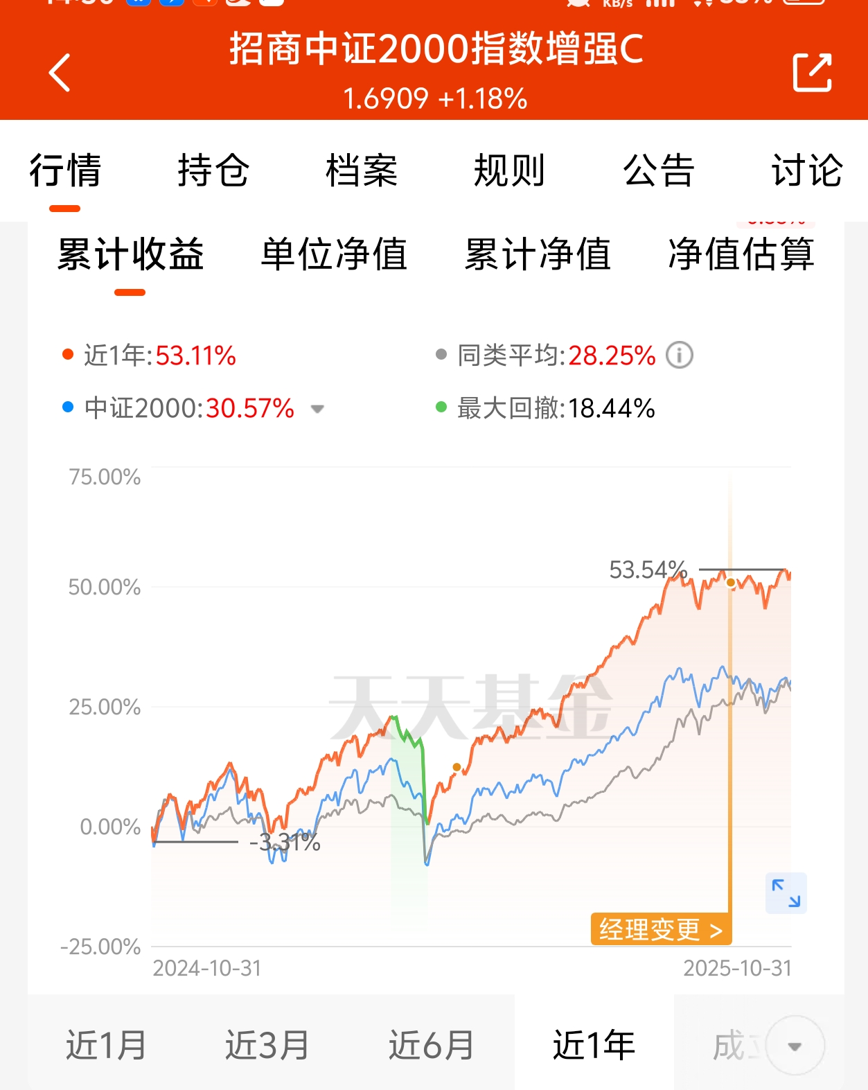 今天大盘探底深v表现还是不错的,值得一提的是中小微盘股,开年以来走势强劲,表现非常优秀。$招商中证2000指数增强C$ 中证2000指增主要跟踪指数,误差小,走势强于大盘指数,在上升通道中,反弹力度更强,更具有韧性。上周五大盘调整,微盘股却是普涨行情,招商中证2000指增上周五涨幅1.18%,近一年涨幅53.11%,远远跑赢大多数板块,行情向好,干就完了