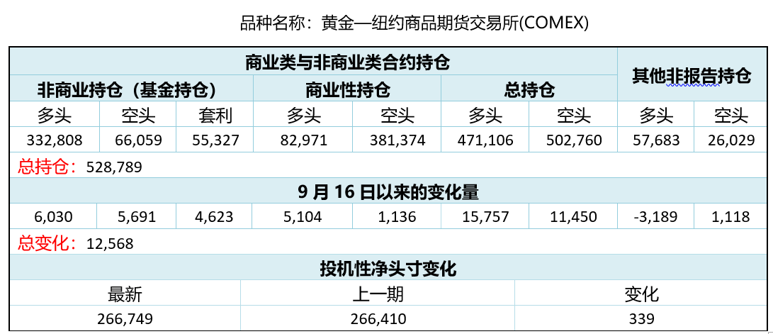 最近一期公布的美国商品期货交易委员会(CFTC)9月23日黄金持仓数据显示:COMEX黄金投机净多头头寸由上一期(9月16日)的266,410手上升至266,749手,净多头头寸增加。