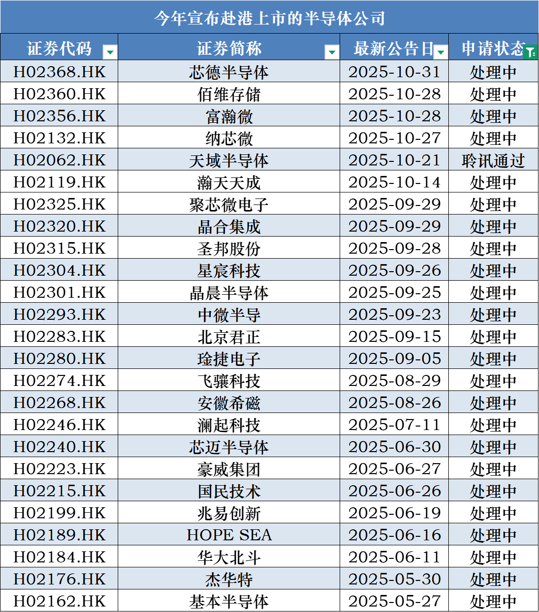 但这次指数改动后就不一样了,港股从此有了专属的半导体产业指数。这个指数之所以能够诞生,其中很重要的一个背景,也是因为今年以来,有超过25家的半导体公司宣布在港股上市,其中不少都是在港股二次上市的。