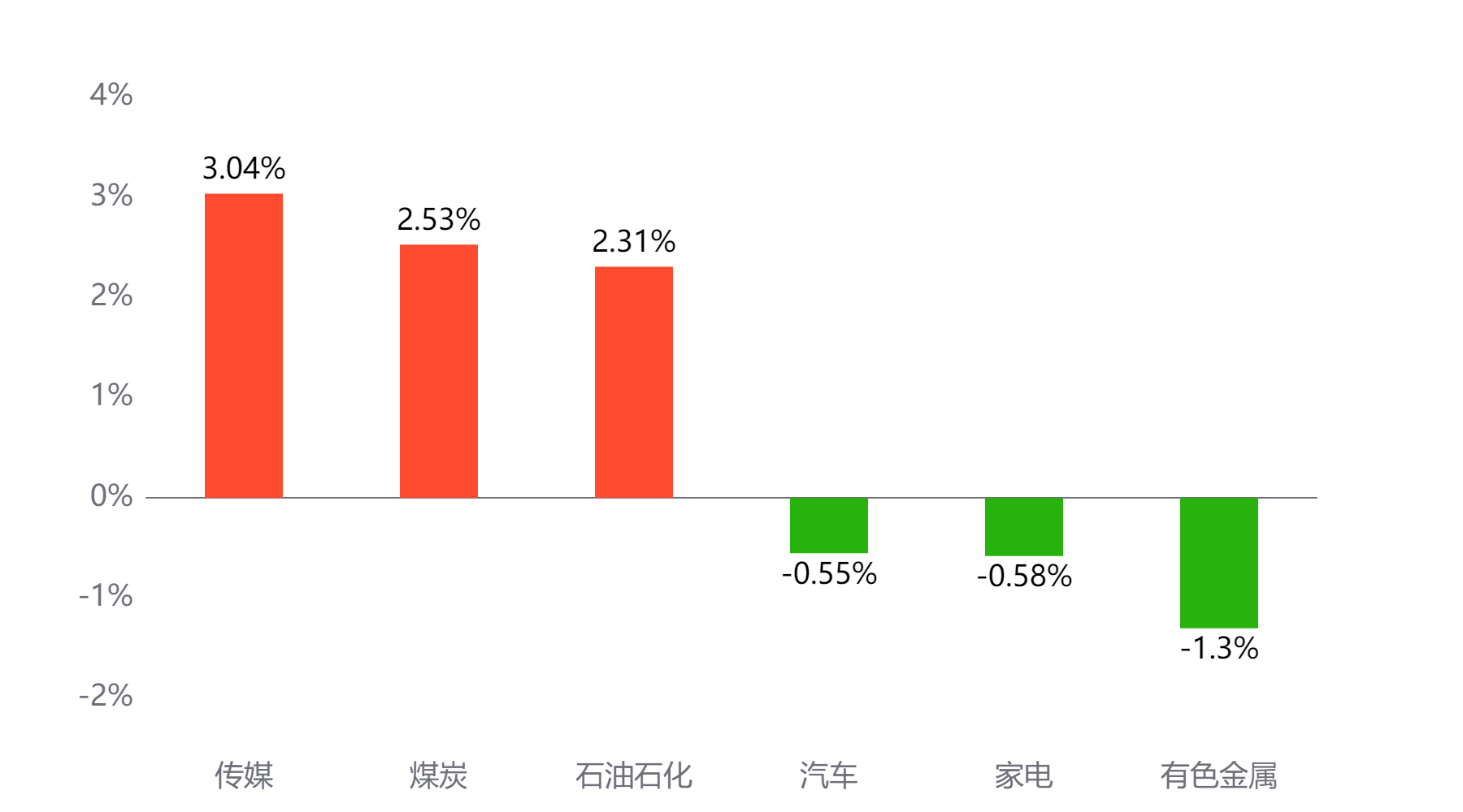 今天表现最好的行业板块依次为传媒、煤炭、石油石化,表现最差的依次为汽车、家电、有色金属。