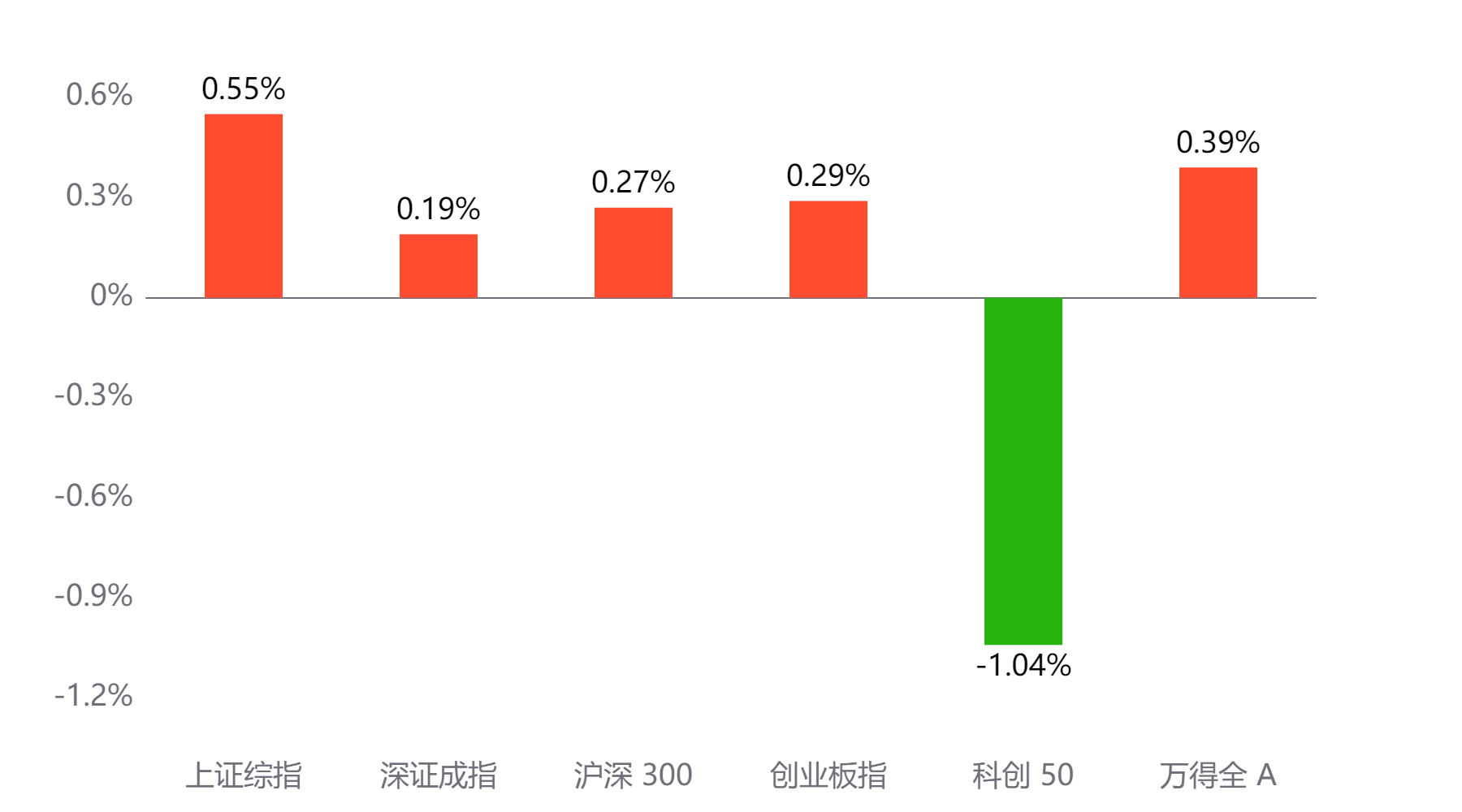 截至今日收盘,市场各主要指数普遍上涨。上证综指收3976.52点,上涨0.55%;深证成指收13404.06点,上涨0.19%;沪深300上涨0.27%,创业板指上涨0.29%,科创50下跌1.04%,万得全A上涨0.39%。