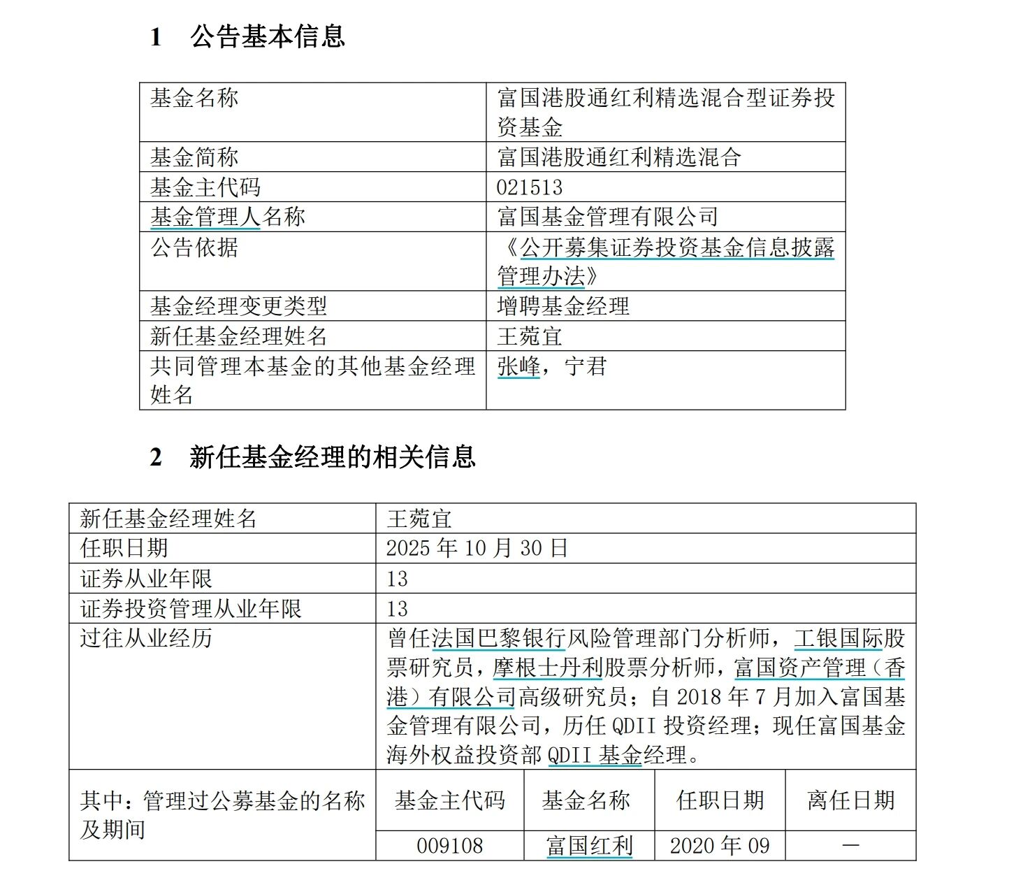 富国港股通红利精选,以投资港股中的高股息股票为主,已经增聘了王菀宜。