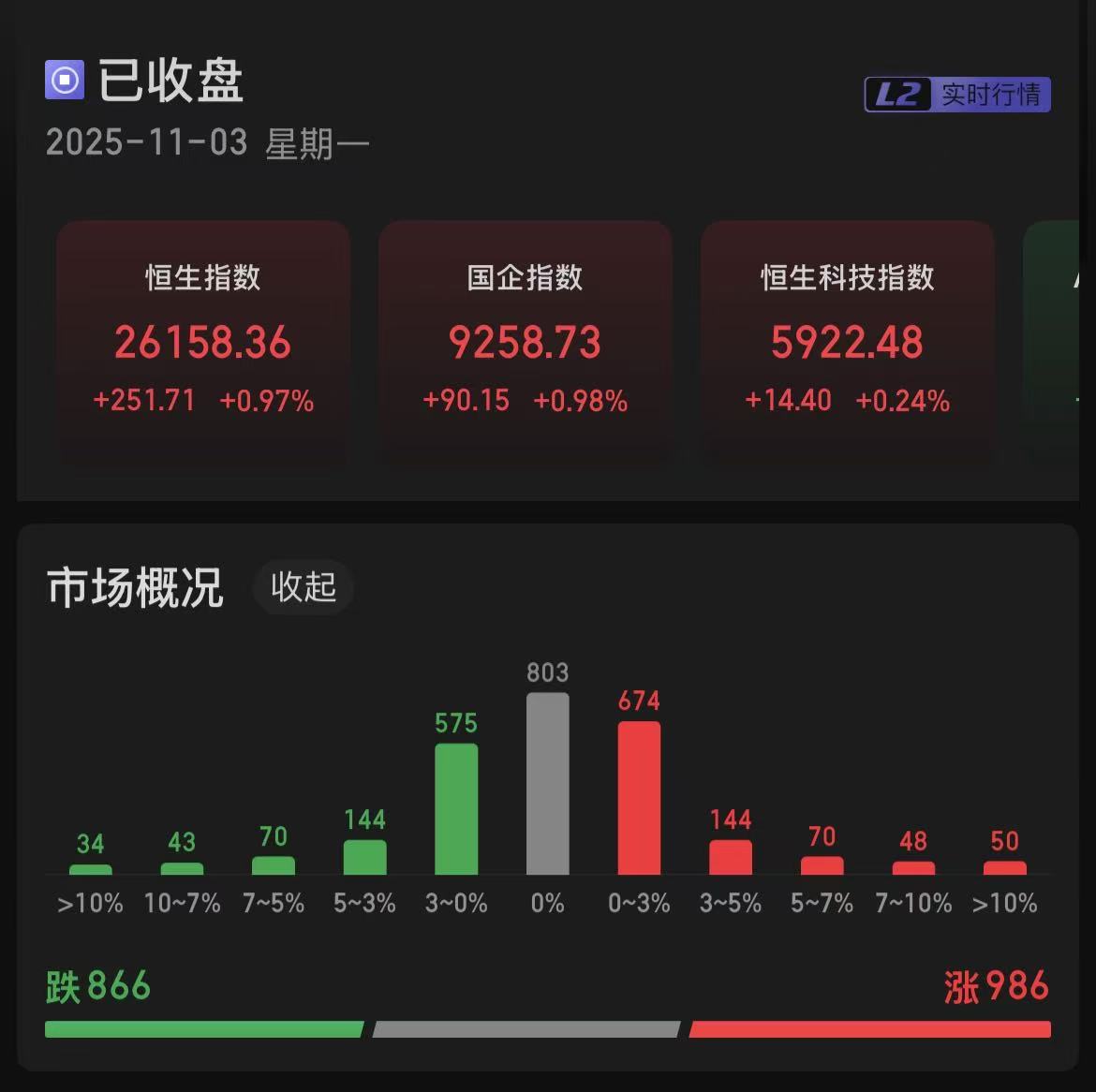 恒生指数上涨0.97%,国企指数上涨0.98%,恒生科技指数上涨0.24%。986只个股上涨,866只个股下跌。南向资金,净买入54.72亿港元。