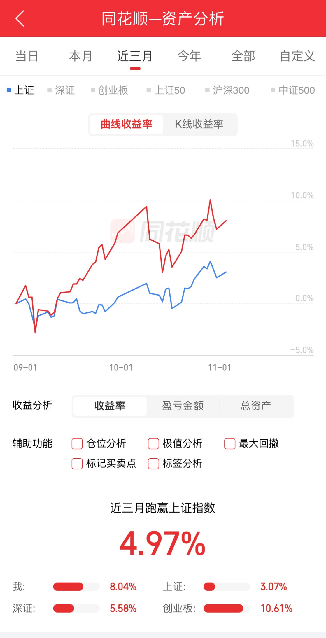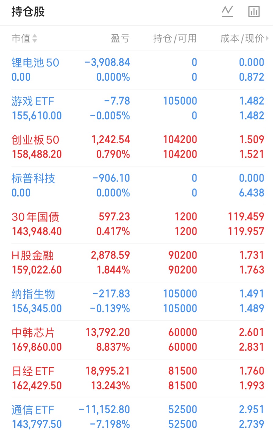 今日账户盈利:9582元。 11月3日,A股三大指数今日集体上涨,截至收盘,上证指数涨0.55%,深证成指涨0.19%,创业板指涨0.29%,北证50跌0.98%。沪深京三市全天成交额21329亿元,较上日缩量2169亿元。全市场超3500只个股上涨。 ETF收盘涨跌不一,中韩半导体ETF(513310)领涨4.62%,光伏ETF龙头(560980)涨4.55%,纳指生物科技ETF(513290)涨4.42%。科创信息ETF(588260)领跌2.23%,黄金股ETF(159562)跌2.11%,黄金股票ETF(517400)跌2.08%。