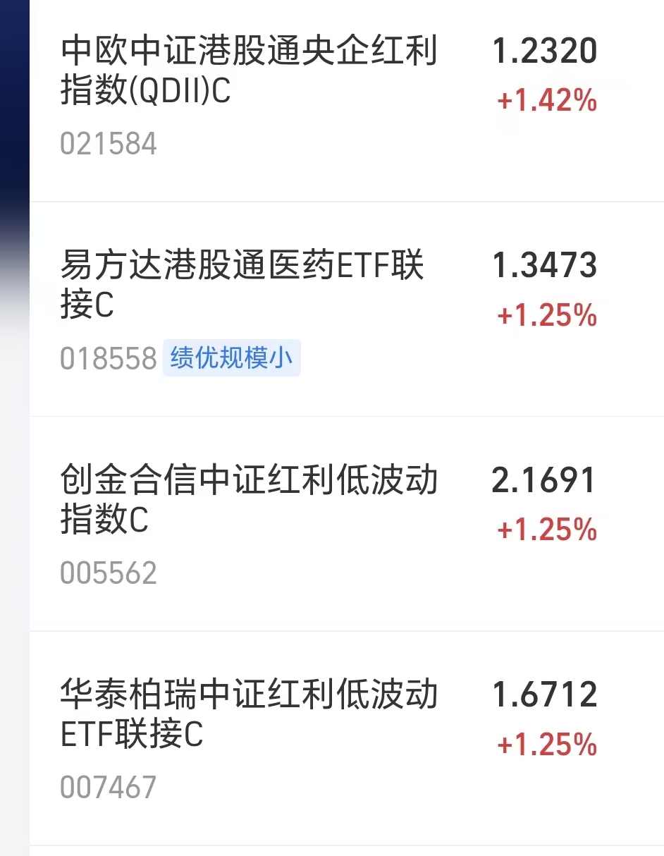 $中欧中证港股通央企红利指数发起(QDII)C(OTCFUND|021584)$今天大涨了1.42%,在同类中排名非常靠前,