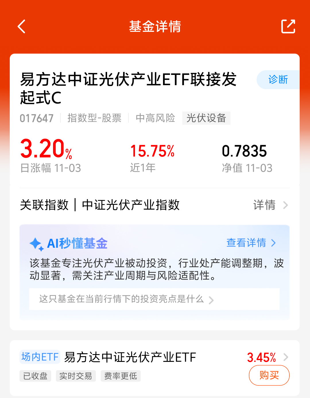 大盘今天低开高走,三大指数拉升翻红,光伏板块今天大涨,这个方向长期来看发展前景还不错,最近终于轮动到光伏板块了,看好这个方向,易方达中证光伏产业C今天涨了3.20%,表现还不错,我准备分批加仓了
