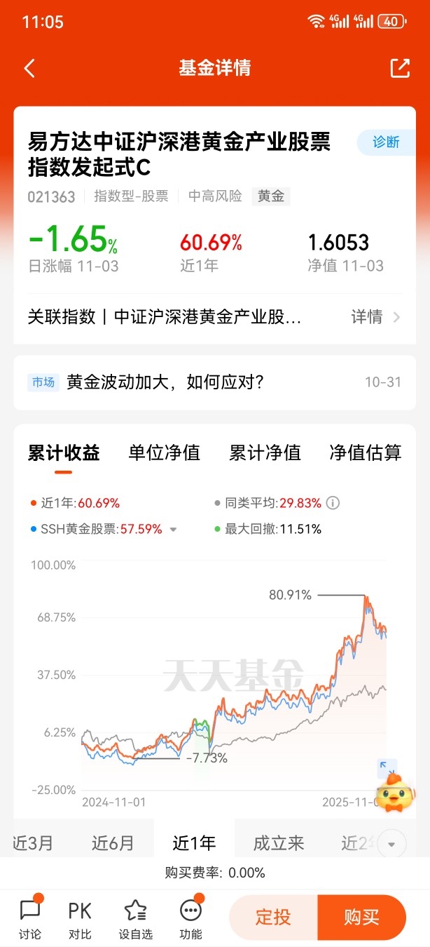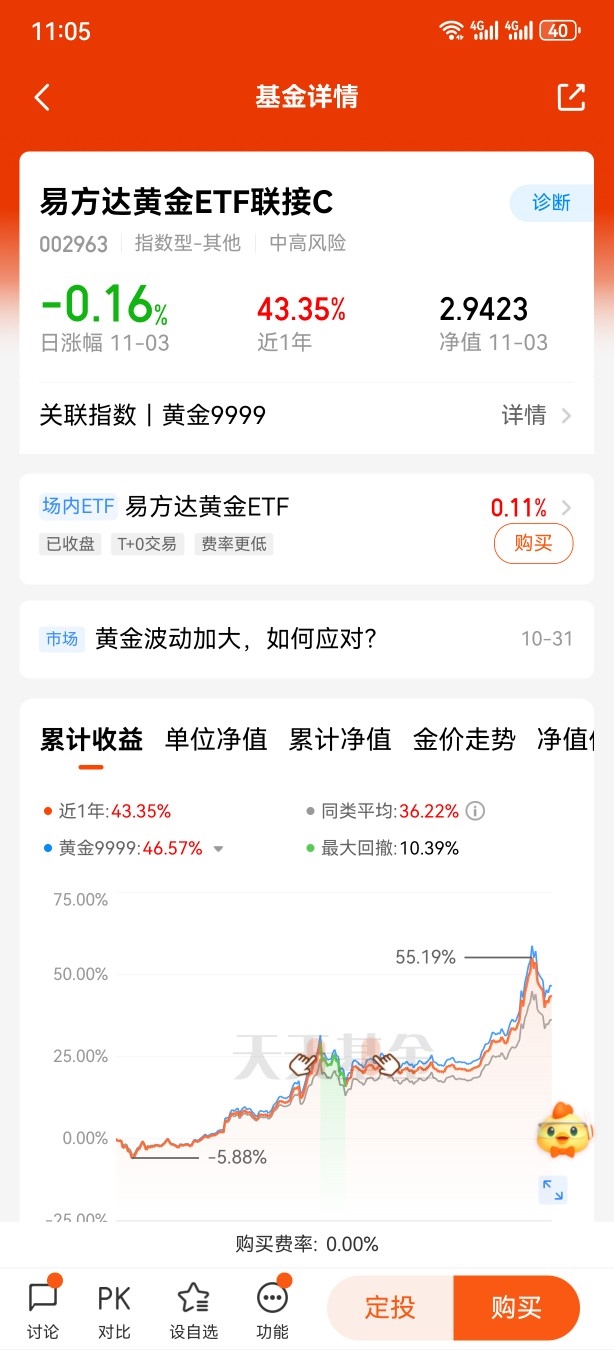 易方达黄金ETF联接C的产品特性恰好适配波动市需求。作为跟踪黄金ETF的场外基金,其风险收益特征与国内黄金现货品种高度一致,能精准反映金价变化,且无需担心实物存储问题。更重要的是,其费率设计对中小投资者友好,短期持有成本可控,契合波动市中灵活调整的需求。