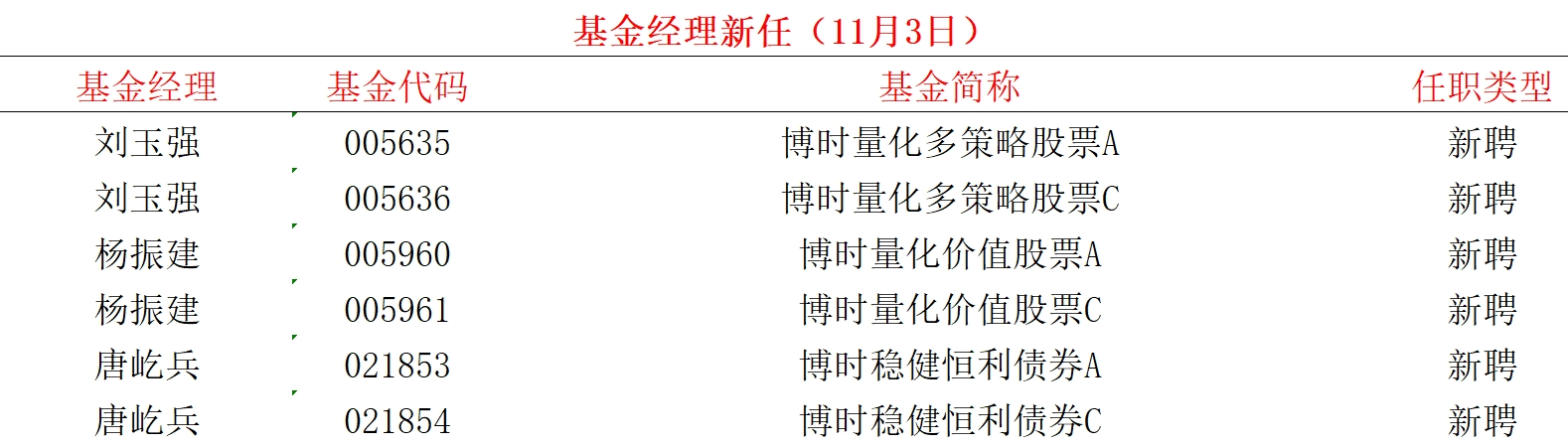 11月3日基金经理变更公告。 新聘3人,涉及6只基金。