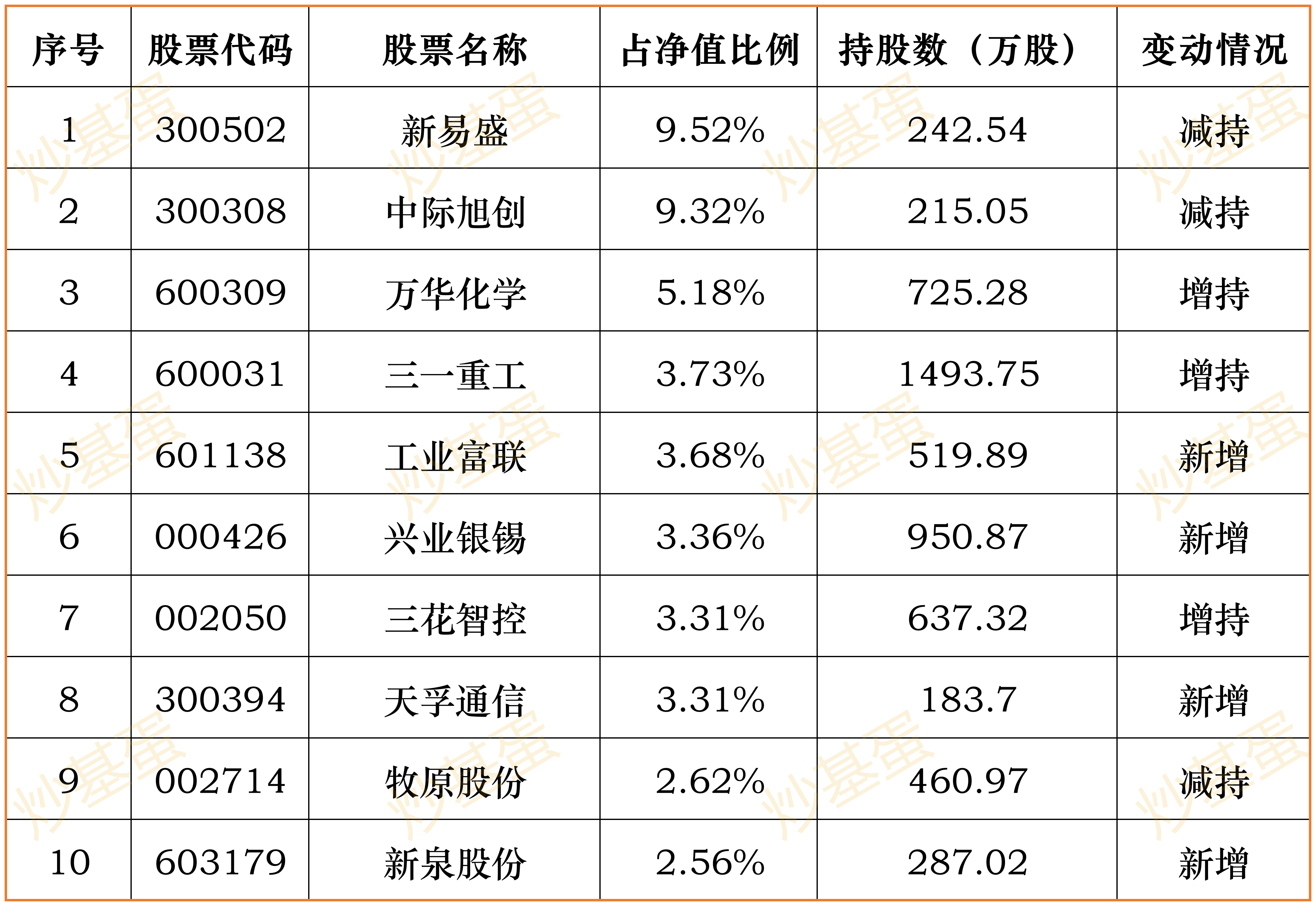 前十持仓股占比33.64%→46.59%,3季度涨53.21%。新增工业富联、兴业银锡、天孚通信、新泉股份,其他各有增减。持股集中度不高,但出现了“易中天”,业绩亮眼。
