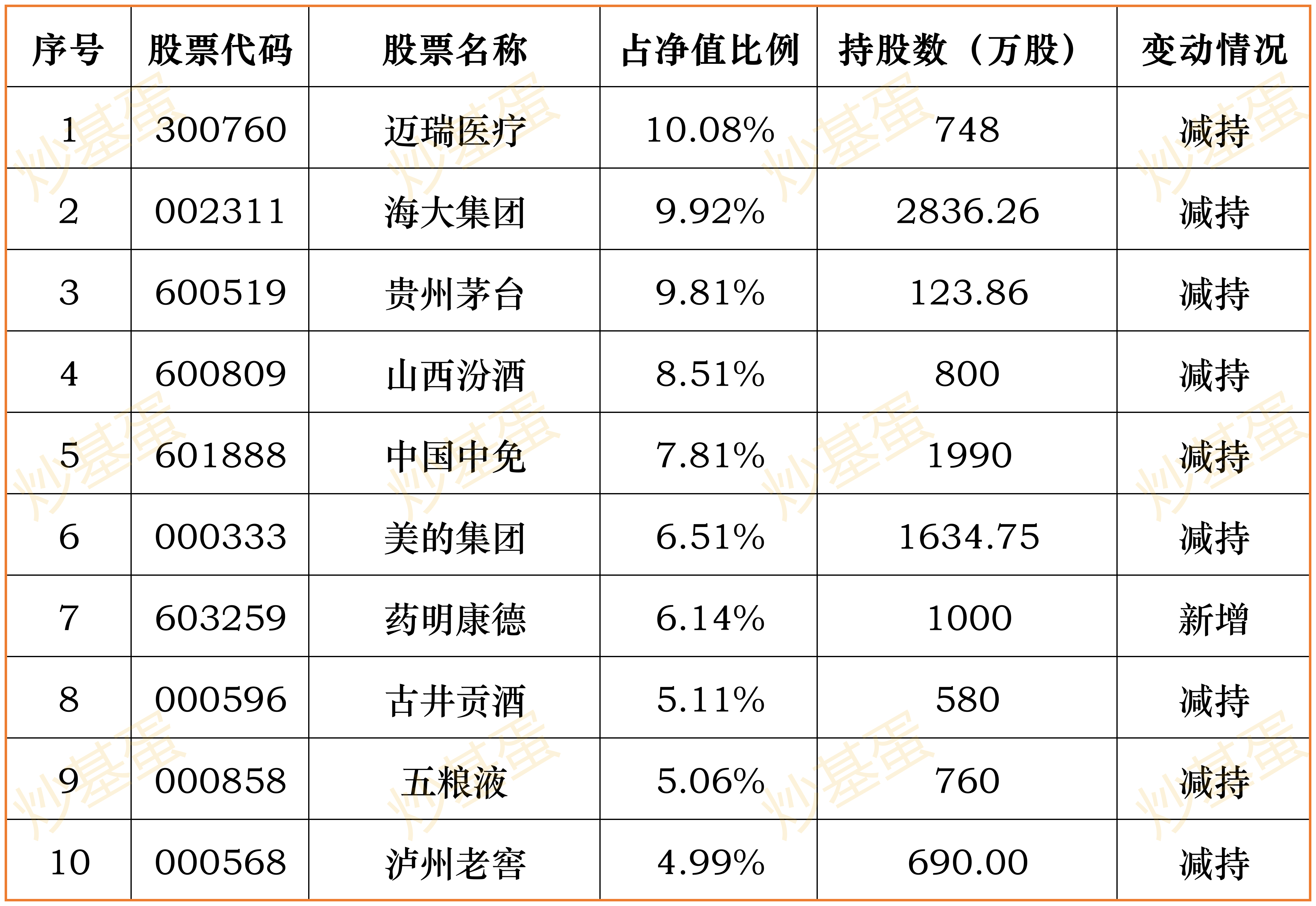 前十持仓股占比76.75%→73.94%,3季度涨9.09%。新增药明康德,其他均有所减持。与张坤一样,也是几年前消费行情走牛积攒的规模,目前看还在这个圈内,继续坚守白酒等传统消费板块。