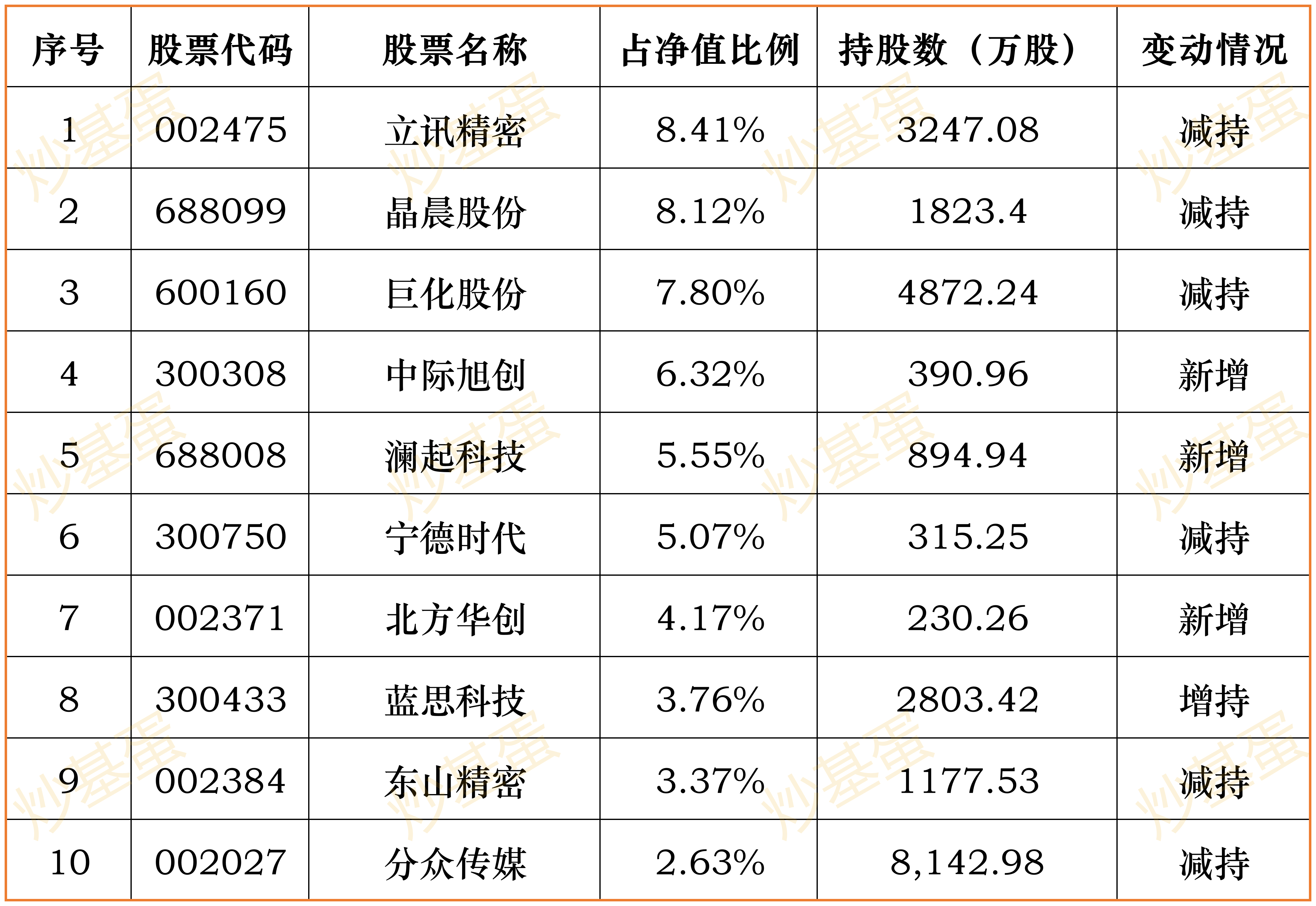 这次找了主动权益基金排名靠前的,主要是管理规模超过300亿的,共计有8位基金经理。通过最新季报里的前十大持仓,观察一下他们的调仓动向。