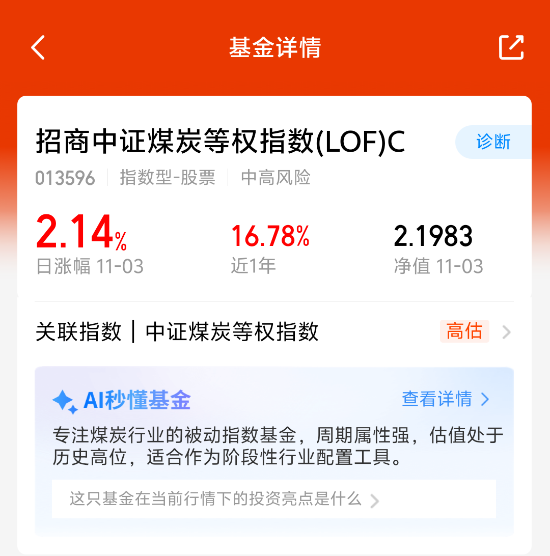 大盘今天震荡调整,三大指数集体回调,煤炭板块今天逆市上涨,$招商中证煤炭等权指数(LOF)C(OTCFUND|013596)$昨天涨了2.14%,近一月涨了14.55%,煤炭板块周期性比较强,四季度又到了煤炭周期了,我还是比较看好煤炭板块的,我准备继续分批加仓了!
