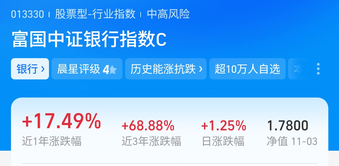 $富国中证银行指数(LOF)C$ ,直接逆市上涨,近一年都涨了17.49%,在弱行情里堪称“避风港”。