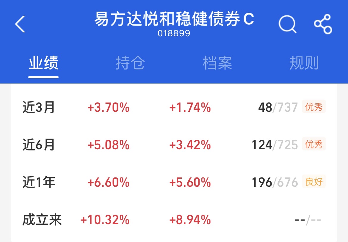 其实从第四季度的行情走势可以看出债市摆脱了前期调整,现在开启了修复态势。宽松的货币政策已经年底资金入场给债市提供了较大支撑,今天继续布局$易方达悦和稳健债券C$ 它是市场稀缺的布局范围多元的固收+基金,债券和股票双轮驱动搭配,同时投资了港股市场,弹性高。包括紫金矿业、港交所、阿里巴巴、腾讯等港股龙头。灵活的持仓配置也收获了超额收益。上周上涨三天,近三月上涨3.70%,近半年上涨5.08%,近一年收益率6.60%盈利能力较强。近1年最大回撤为1.49%,抗下跌能力较强,继续埋伏四季度行情