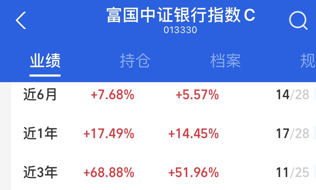 今天继续补仓富国中证银行指数C,股市震荡,指数分化,随着环境的优化和资金持续流入,银行板块估值也在加速修复中,四季度红利资产配置价值凸显。该基金精准跟踪中证银行,同指数下的第一梯队。聚焦金融投资风格稳定,持股集中度高,成分股包括招商银行、兴业银行、工商银行、农业银行、交通银行等等银行业的核心企业,它们在资产规模、业务覆盖以及市场影响力上都占据关键地位,信用等级较高,收益稳健。昨日上涨1.25%,年化收益率17.49%,当前市场风险偏好有所降低,我也去避避险,小投一笔了
