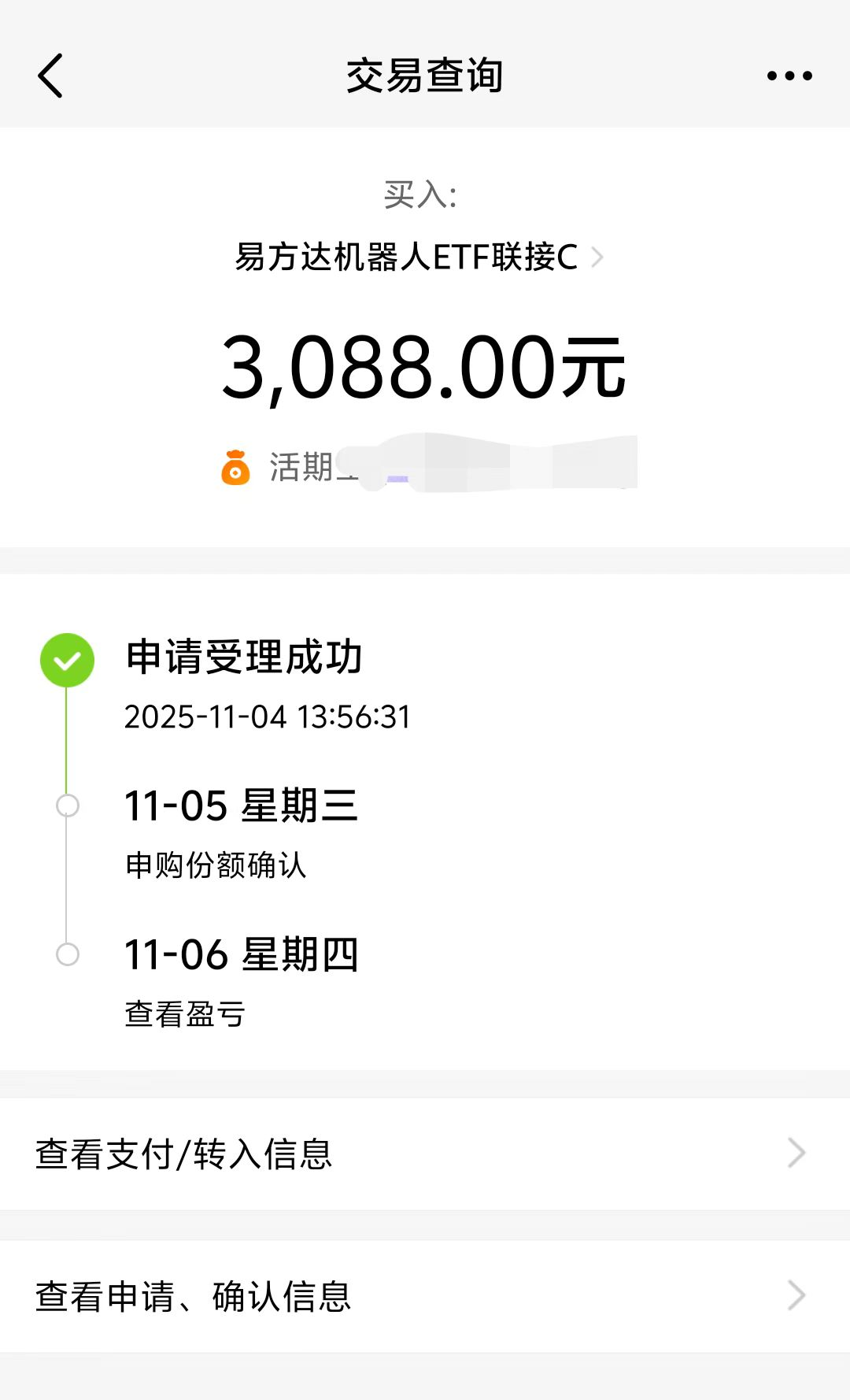 大盘今天震荡调整,机器人板块回调了,机器人板块发展前景还不错,长期看好这个方向,近期回调我准备分批加仓了!趁着回调今天加仓易方达机器人联接C3088元,近一年涨了12.93%,看好这个方向!