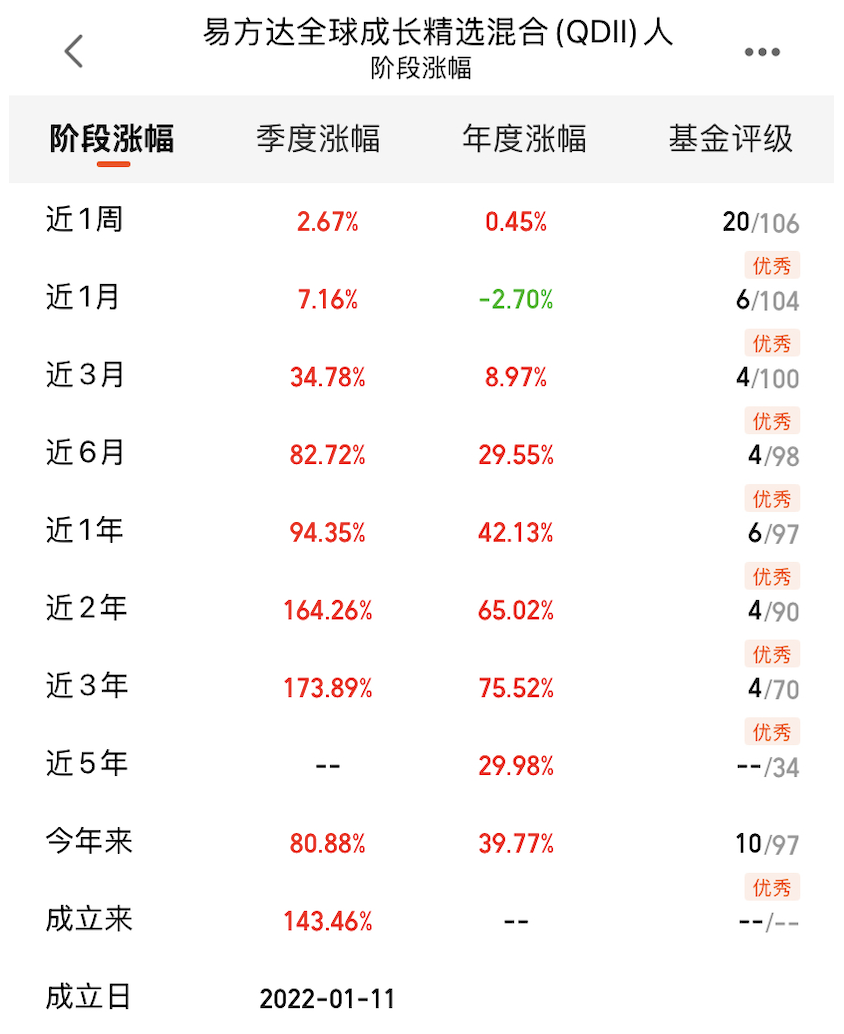 在这样的市场格局下,易方达全球成长精选混合(QDII)(012922)展现出卓越的全球配置与灵活调仓能力:$易方达全球成长精选混合(QDII)人民币C(OTCFUND|012922)$