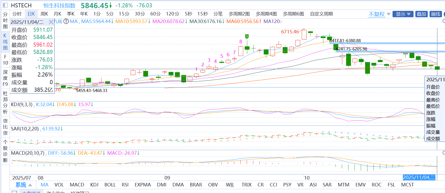恒生科技:午盘跌0.2%,现在一度跌逾2%,指数在5900点附近磨底,整体仍处于震荡探底过程中。暂未出现明确止跌信号。麦爸选择躺平,耐心等待指数企稳和更明确的反转信号。