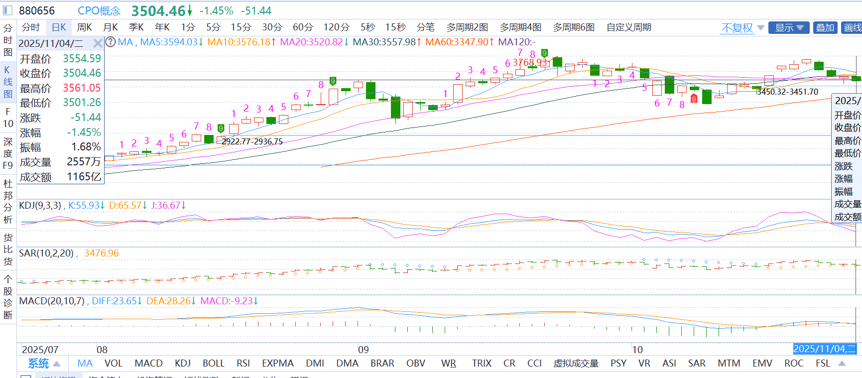 CPO:前两天麦爸已加仓,虽今日未大涨,但AI长期逻辑还在。技术面处于调整后企稳阶段,不用频繁操作,麦爸今日躺平观望更踏实,短期是有技术性反弹需求的。