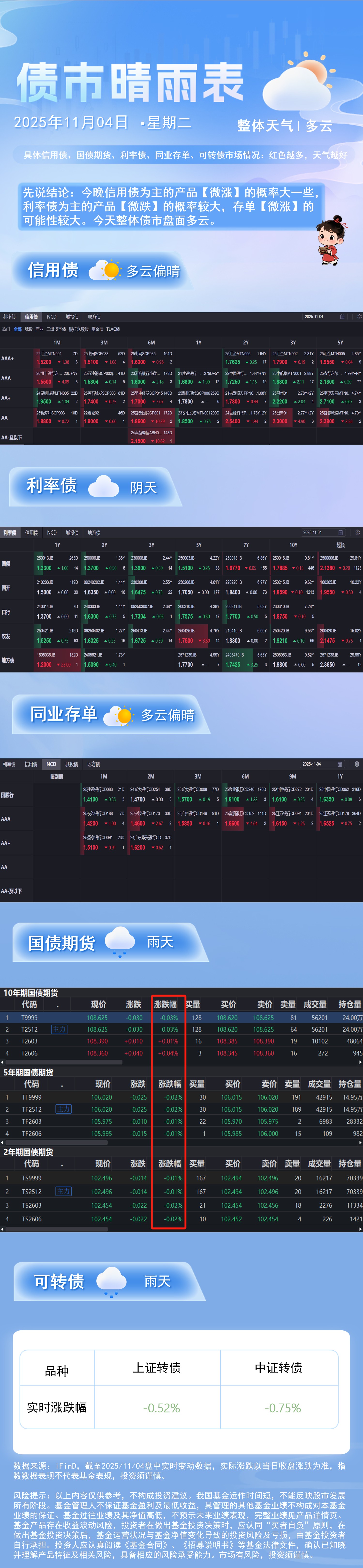 先说结论:今晚信用债为主的产品【微涨】的概率大一些,利率债为主的产品【微跌】的概率较大,存单【微涨】的可能性较大。今天整体债市盘面多云