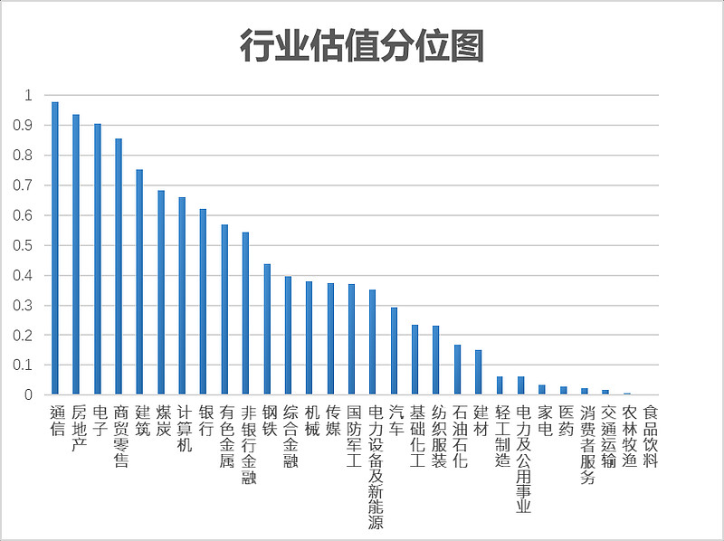 根据招财乐投顾行业估值分位统计,通信、房地产、电子的估值水平处于近五年历史90分位以上,轻工制造、家电、交通运输、医药等8个行业估值处于近五年10分位以下。