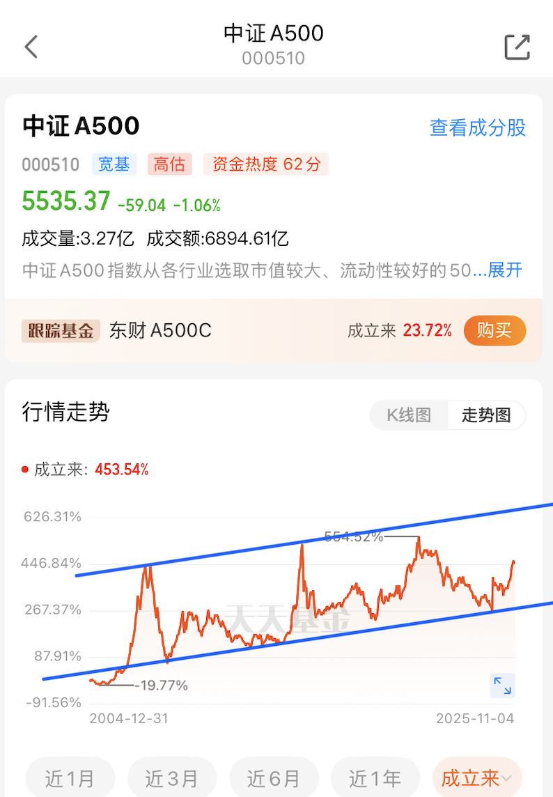 在这样的结构性行情中,指数基金更具配置价值。中证A500指数覆盖沪深市场中盘优质企业,行业分布均衡,成分股多为细分行业龙头,能有效分散风险。相较沪深300,它更有成长弹性;相较中证1000,波动又更温和。