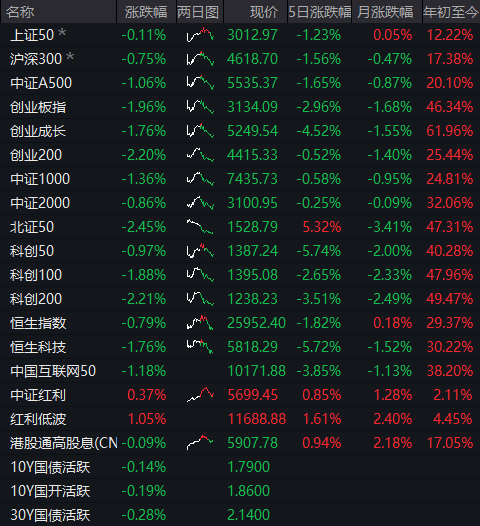 今天A村主要指数普跌,昨天缩量V型反弹之后,今天踩刹车失败重回下跌状态。行业5涨26跌,前三银行+2.03%、公用事业+0.24%、环保+0.15%,后三有色金属-3.04%、电力设备-2.05%、医药生物-1.97%。又回到了银行护盘的节奏。
