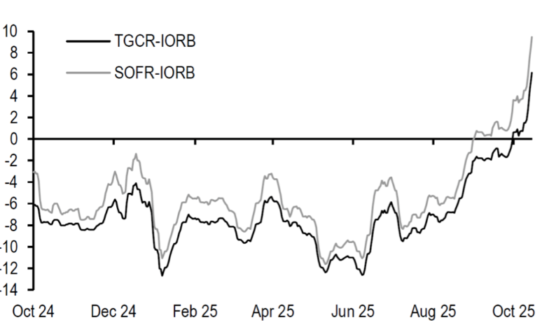因为美国政府持续停摆,财政部被迫从市场上抽水囤积现金以备不时之需,导致在美联储的账户(TGA)现金余额在短时间内从3000亿飙升至1万亿美元。