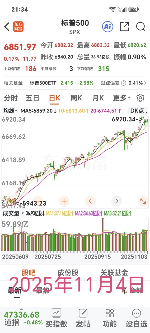 另外标普500虽然短期均线还是多头排列,但至11月3日己收5根阴线,纳斯达克也是连续3根阴线,因此美股短期也面临极强的回调压力。