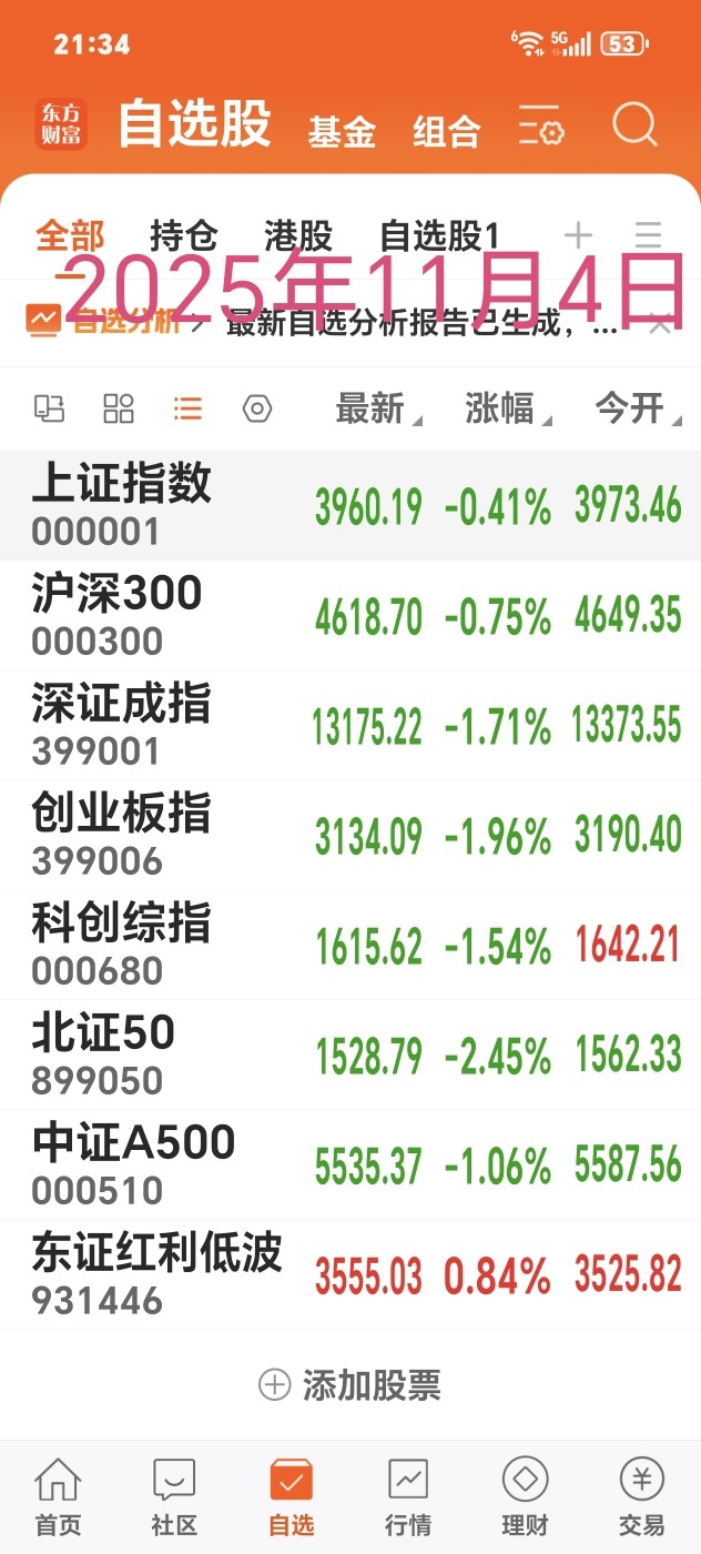 今日A股市场继续下跌整理,几个综合指数全部阴线报收,其中北证50跌幅达到2.45%,创业板指、深证成指、科创综指跌幅也在1.5%以上。从近几日的市场表现看,自10月29日市场高点以来,上证指数、深证成指、创业板指己是三阴夹一阳,科创综指更是连续四个阴线,以上情况表明短期市场继续下探的可能性很大,操作上应休息观望,等待止跌止稳之后再进场较为稳妥。