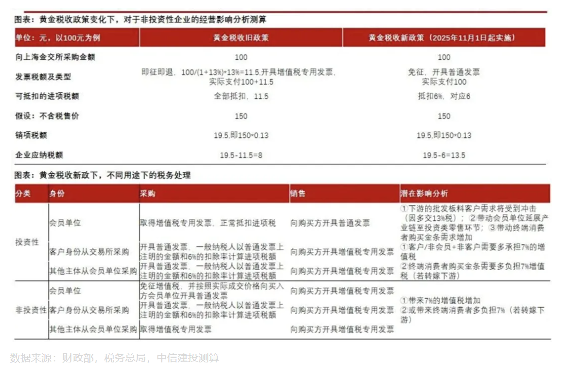 1)对于非投资类的黄金企业(如饰品、工业用途),因进项税抵扣减少(由13%降至6%),对于成本端或有所提升,结合当下金价,预计成本增加在60元/g+;