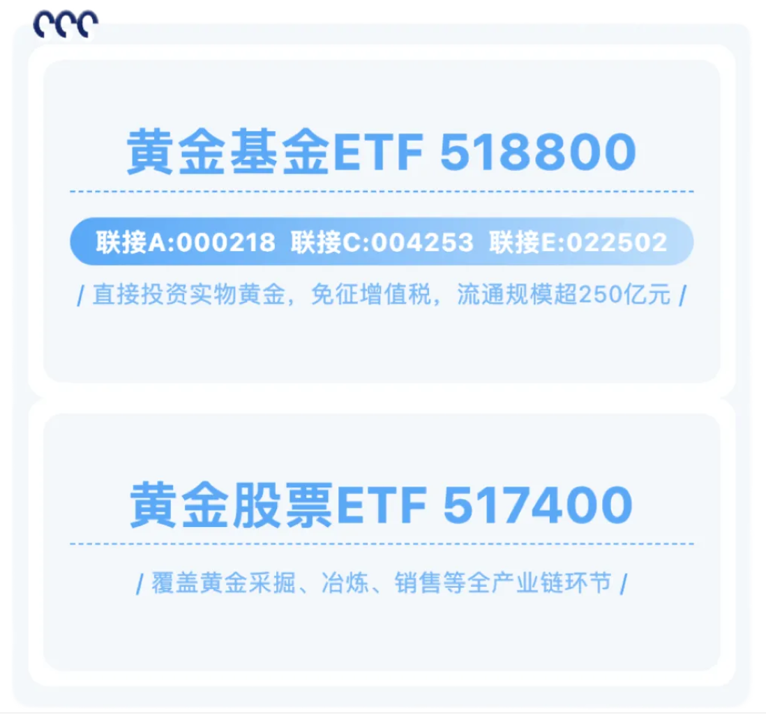 数据来源:Wind,时间截止2025/11/3,基金规模变化波动,仅供参考,不预示未来表现,也不构成投资建议或承诺,基金有风险,投资需谨慎。金价短期涨幅过快,请关注可能存在的回调风险,投资需谨慎。黄金基金ETF主要投资对象为黄金现货合约,预期风险收益水平与黄金资产相似,不同于股票基金、混合基金、债券基金和货币市场基金。联接基金主要投资对象为国泰黄金ETF,预期风险收益水平与黄金资产类似,不同于股票基金、混合基金、债券基金和货币市场基金。如需购买相关基金产品,请关注投资者适当性管理相关规定,提前做好风险测评,根据自身的风险承受能力购买与之匹配的基金产品。
