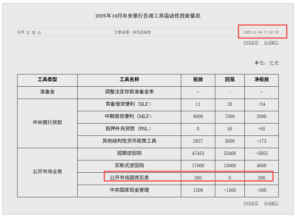 10月央妈公开市场国债买卖净投放200亿——今天下午5点,央妈在官网发布了10月各项工具流动性投放情况,其中最受市场关注的就是10月国债买卖的量级了,考虑到10月27日才宣布恢复国债买卖操作,所以也符合预期。不过我们之前也分析过,在央妈宣布即将恢复国债买卖操作后,债市其实已经定价了这个利好消息,考虑到央妈操作的根本目的是维稳,而不是大力刺激,所以采取这种温和的规模是符合其政策意图的。