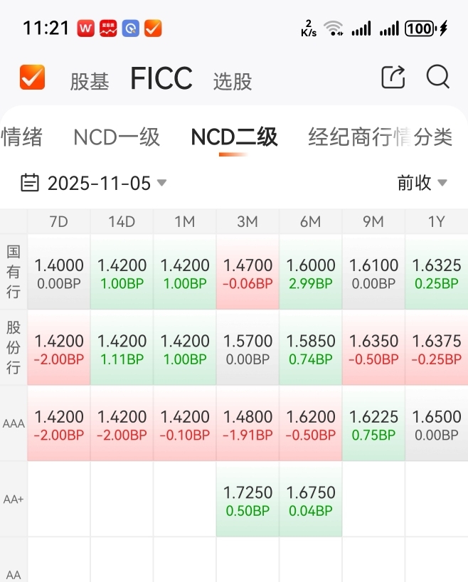 观察同业存单:9红、4平、10绿。(红色,是涨。绿色,是跌。)