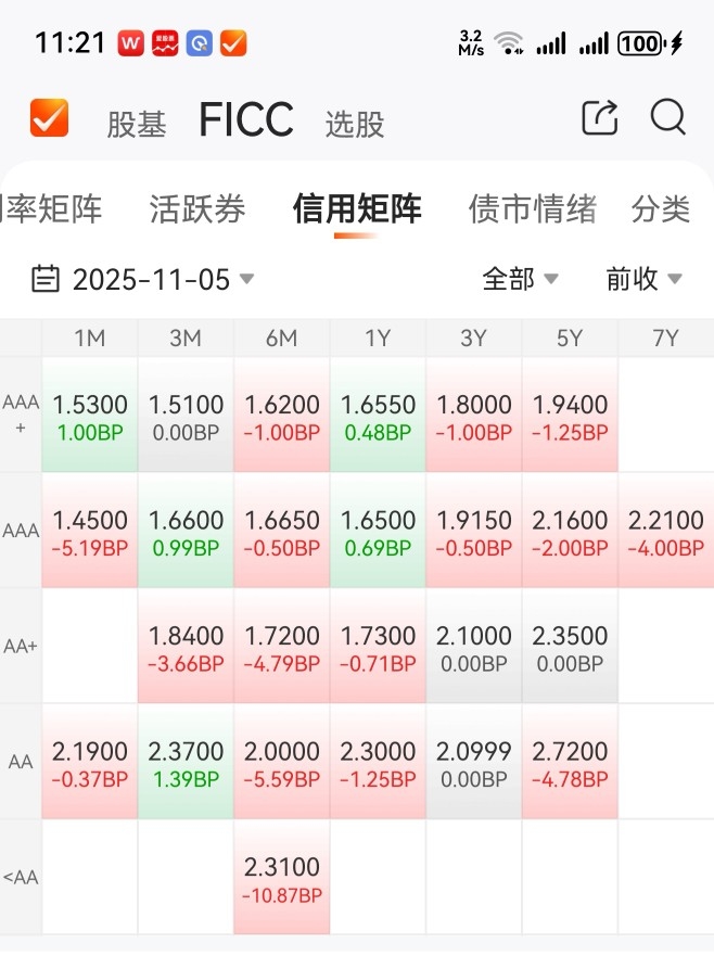 观察信用债:16红、4平、5绿。(红色,是涨。绿色,是跌。)