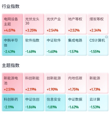 电网设备、光伏龙头、地产等权、电池等涨幅靠前,创新药、信创和信息安全等下跌。