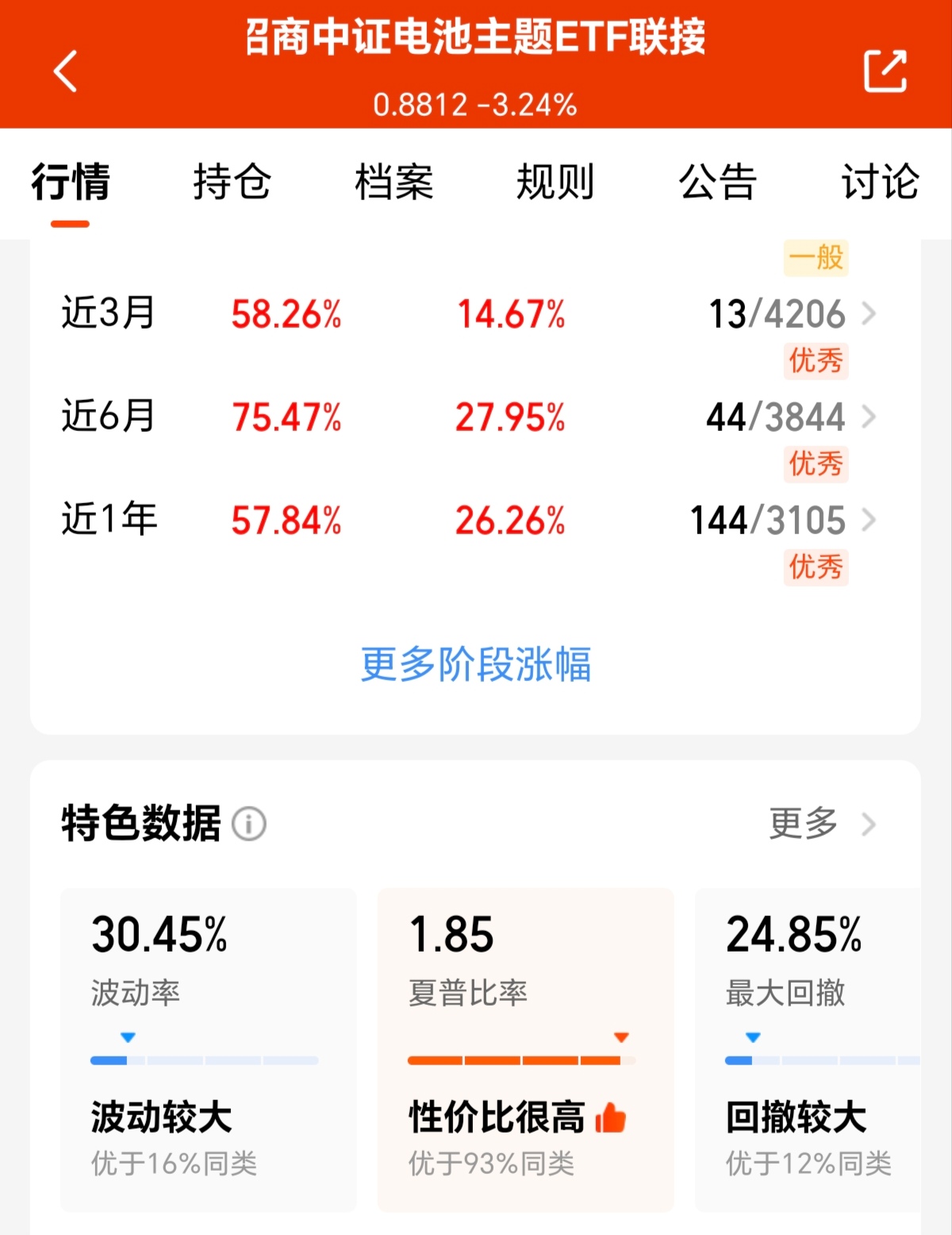 今日A股震荡调整,三大指数集体下跌,板块之间还是分化明显,不过行情向上趋势仍然不变,而电池赛道迎来强有力的反弹,在“十五五”规划明确将新能源打造成新兴支柱产业,从而推动电池产业的发展,而第三季度多家电池板块上市公司业绩表现亮眼,这些利好消息都是推动其上涨的动力,同时$招商中证电池主题ETF联接C(OTCFUND|016020)$紧密跟踪中证电池指数,目前实时估值上涨1.7%,近6个月涨幅超75%,我觉得后市行情还非常可期!