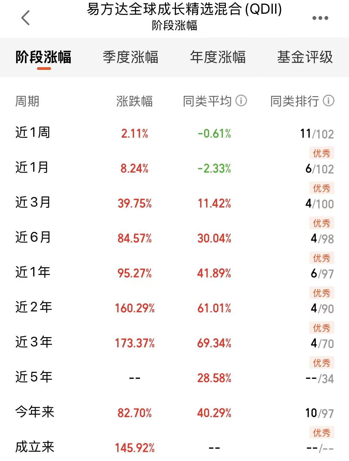 今天的A股还是震荡调整,都回调好几天了,天难了,美股这边昨夜也迎来小幅度调整,把问题不大的,全球经济科技在不断的突破,科技赛道长期趋势不变。易方达全球成长精选混合(QDII)人民币C布局A股美股和港股科技资产成长方向,近一年收益率95.27%,成立以来年年正收益,表现出色,我也是比较看好的。#“马”字辈股大涨!“玄学炒股”又来A股?#$大成港股精选混合(QDII)A(OTCFUND|011583)$ #大消费板块逆市拉升!行情能否持续?#