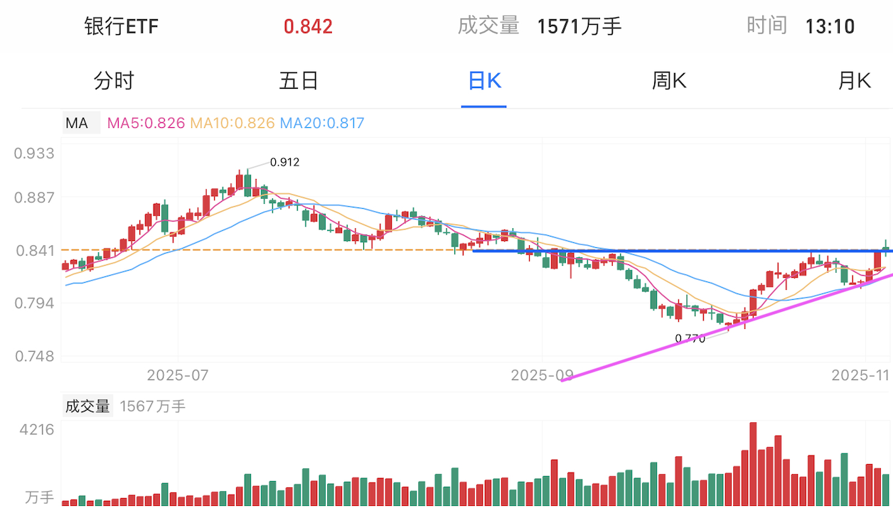 银行此前震荡下行,最近出现放量反弹,突破下跌趋势线,然而很快回落,这两日再攻,刚好涨至压力位,突破才能确定回升。目前仍在压力位徘徊。