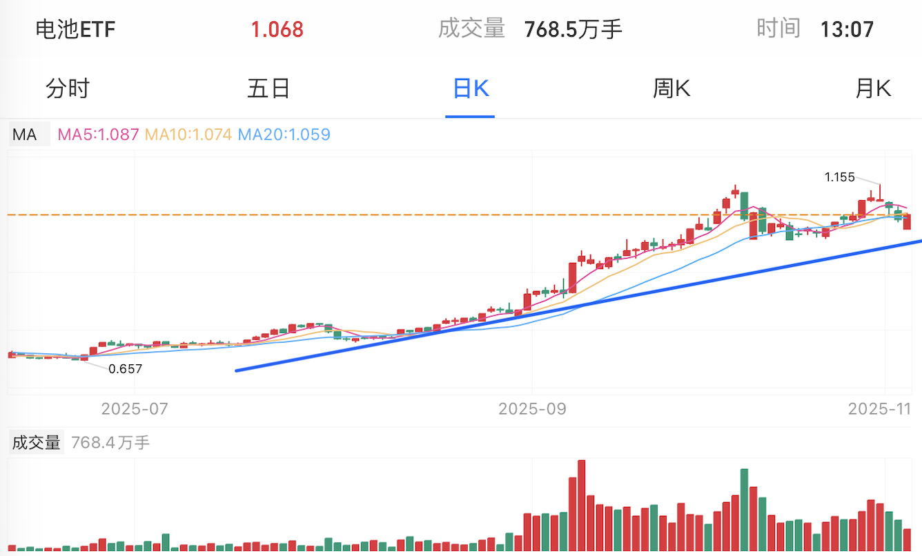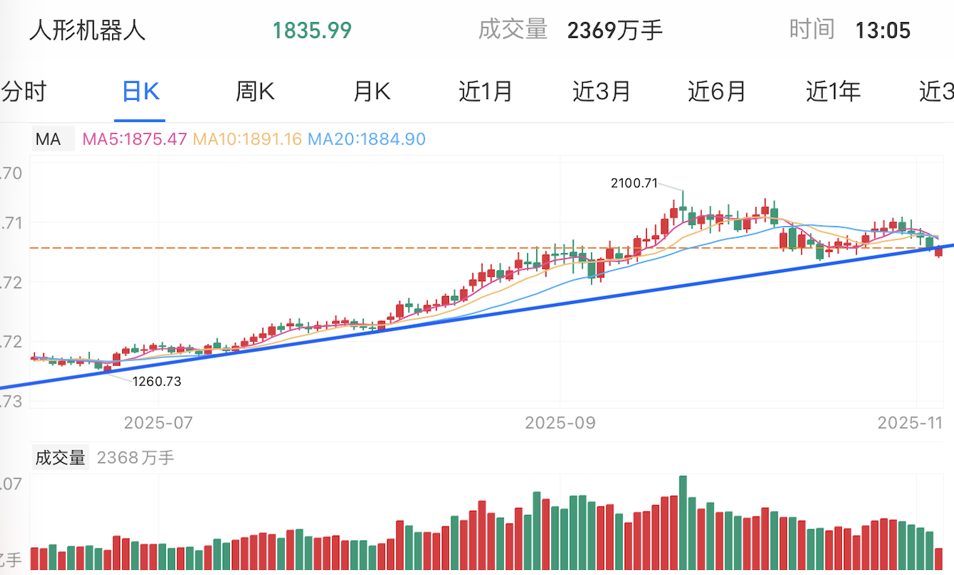 人形机器人、电池此前有一波较大行情,这两日已经跌破上涨趋势线,跌至前低支撑位,短期可能陷入盘整,如果再次跌破前低支撑位,那么此次行情可能结束。
