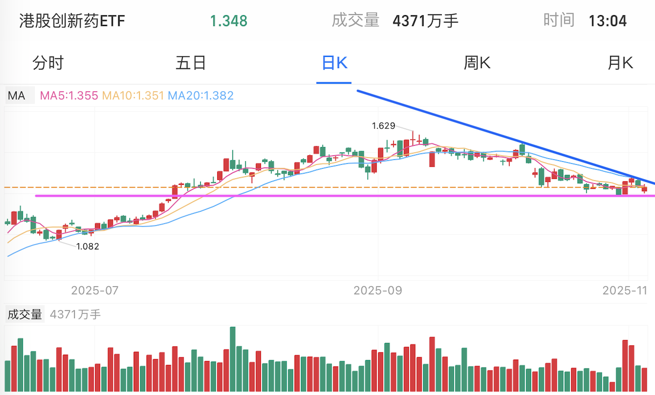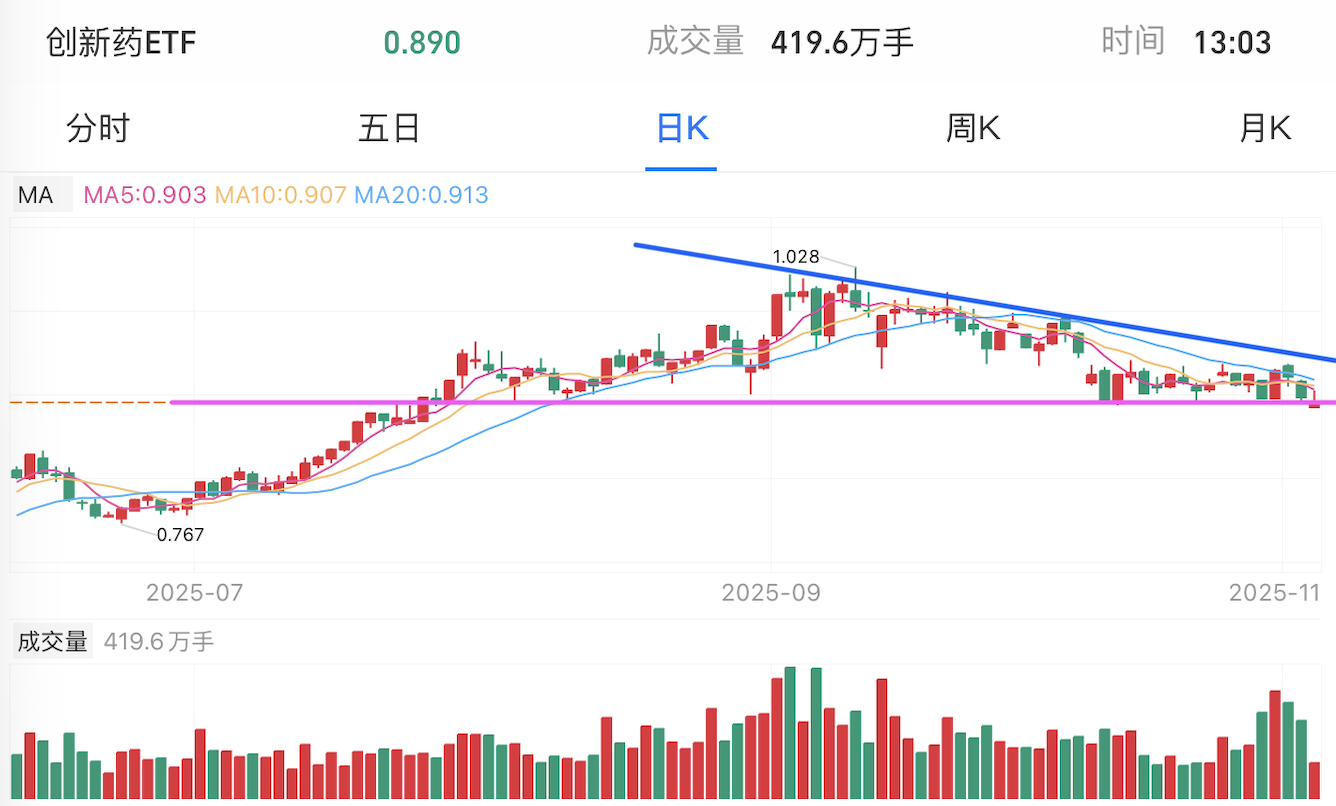 创新药和港股创新药近期在大幅上涨后力竭回落,跌破上涨趋势线,最近在下行途中突然放量反弹,然而这两日再次回落至支撑位,跌破则就此下行。